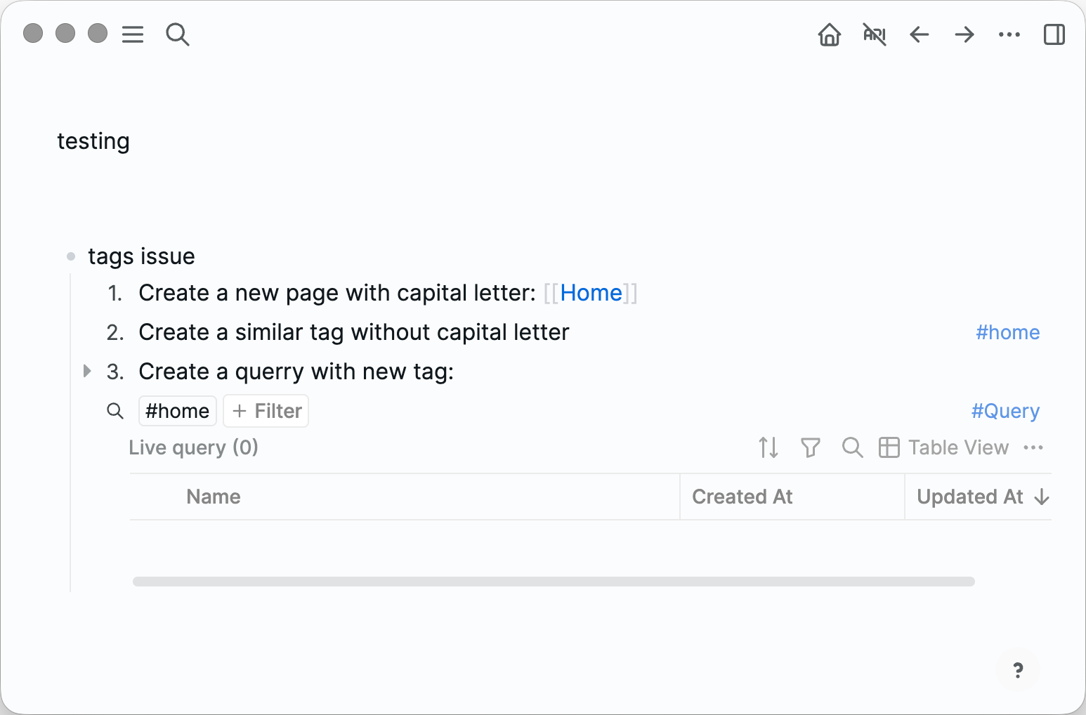 I believe there are different ways to get this issue, such as renaming, deleting, and recreating pages and tags with similar names—which is what I did. But also, there is a very simple way to get an unqueriable tag: