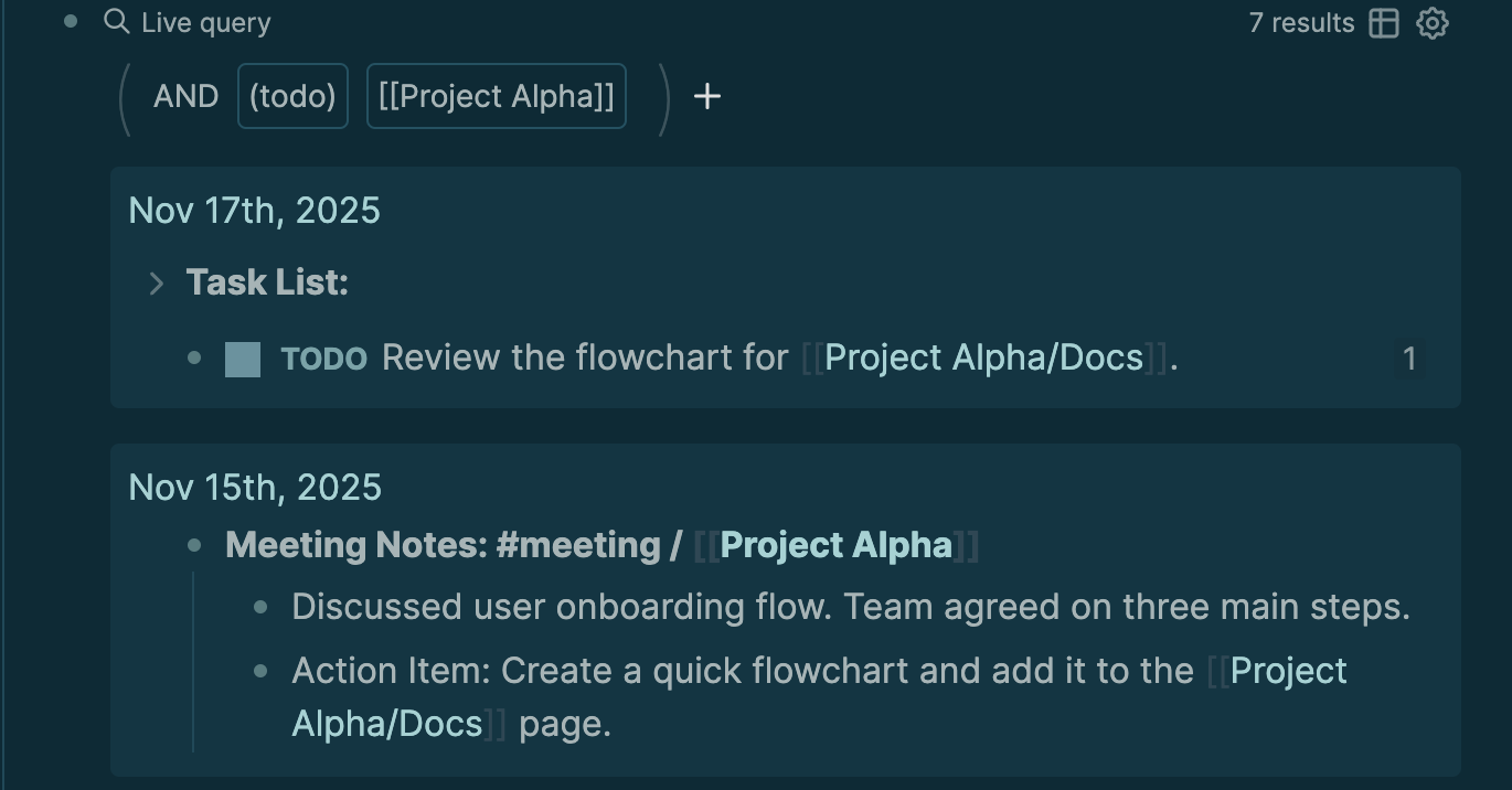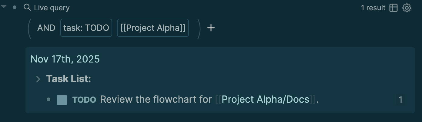 I am trying to learn Query by creating Project Alpha and some tasks. Then I typed /q, select query, then TASK then TODO. After that I clicked the + sign, select Page reference and then Project Alpha. It ended up with this {{query (and (task TODO) [[Project Alpha]])}}